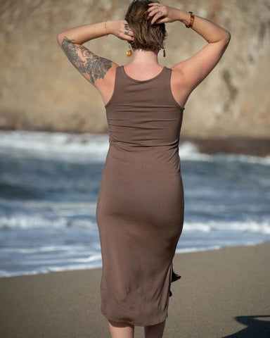 This simple tank dress features a round neck and small side slits, and is mid calf length. It can be worn with the high neck in the front or the back.