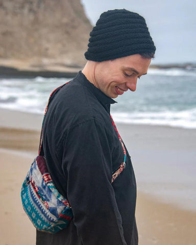 This one-of-a-kind small sling bag is made from traditional Indian shawls. It features adjustable straps, a zipper closure, and two inner pockets.
