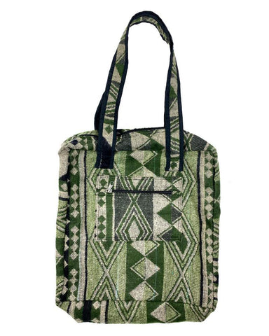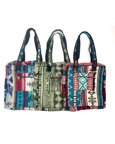 This one-of-a-kind tote bag is made from traditional Indian shawls. It features two handles, a zipper closure, outer pocket, and is lined with cotton. This bag is available in assorted colors only.