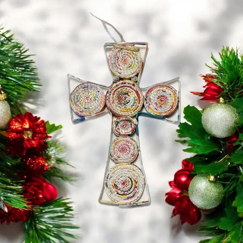 Add a touch of elegance and sustainability to any space with our beautifully crafted cross ornament, made from recycled materials by talented Vietnamese artisans.