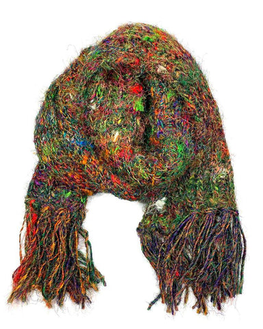 This simple yet elegant scarf with tassels is hand knit with upcycled silk and is available in assorted mixed colors, no two will ever be exactly alike!